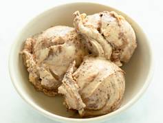 A white bowl with 3 scoops of Berry Banana Sorbet and a white spoon