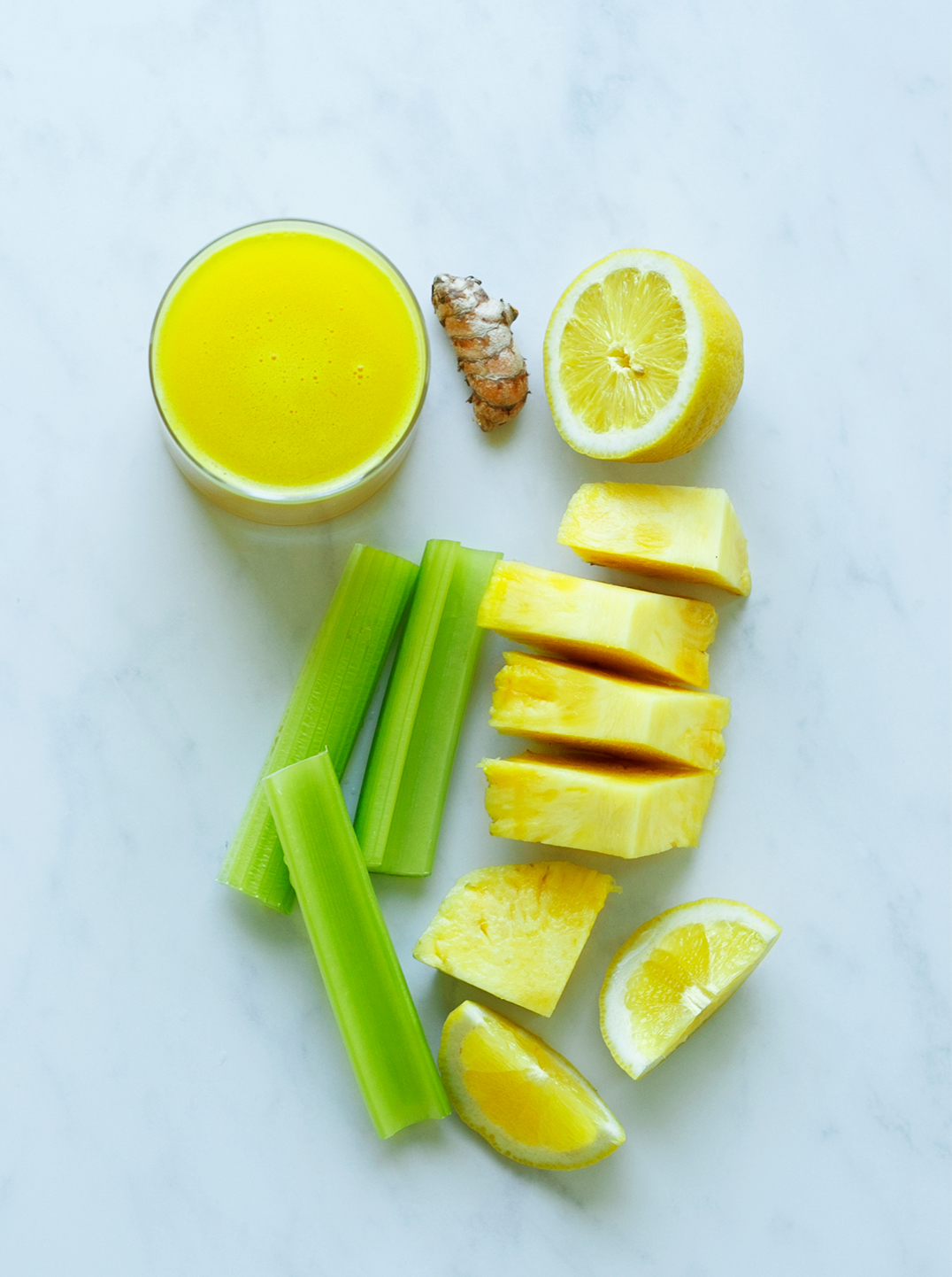 • Juice the celery, pineapple, lemon, and turmeric.⁣