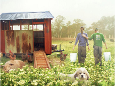 Overhead shot of a cutting board with herbs shallots and a small bowl of rich yellow herby shallot vinaigrette