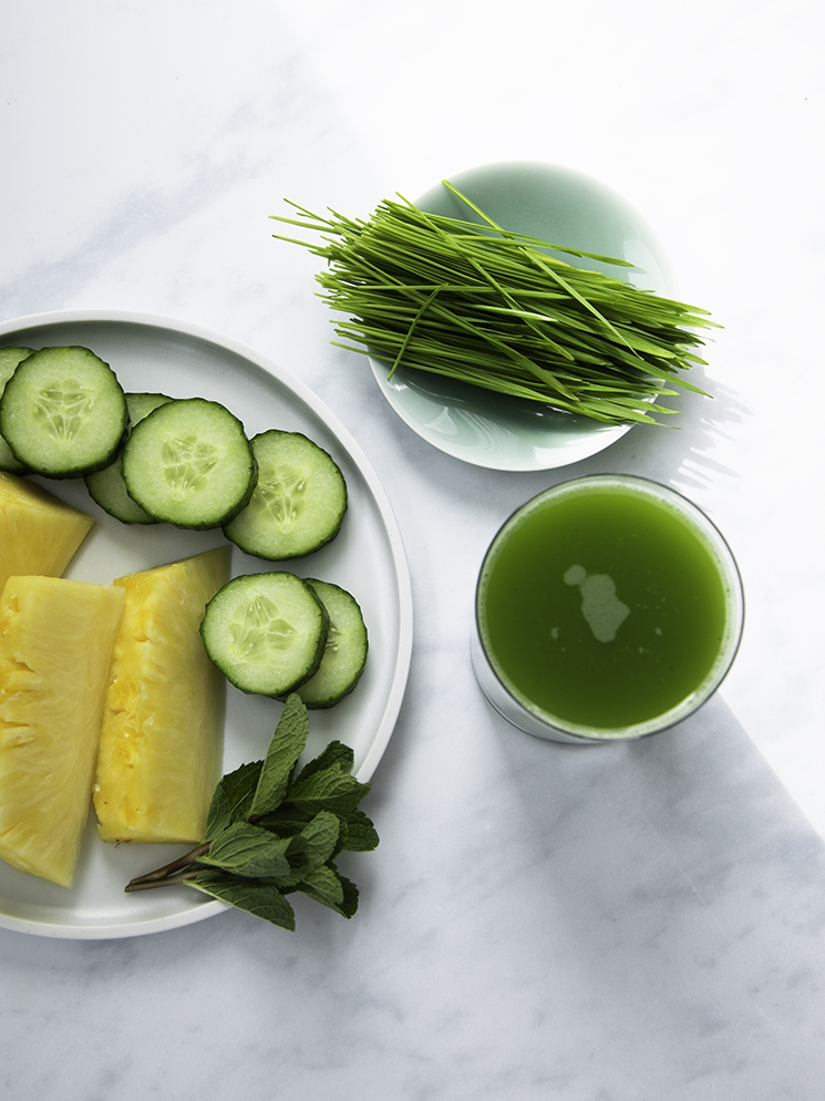 A detoxifying and cleansing juice. The grassy flavor of wheatgrass gets masked with the sweet pineapple and refreshing mint.