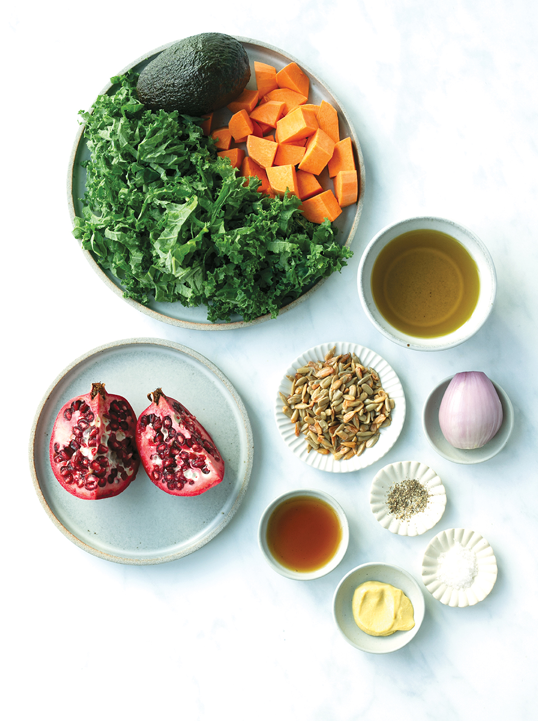 • Combine the kale, sunflower seeds, pomegranate seeds, and sweet potatoes, then drizzle ⅓ of the dressing over the salad and toss to coat.⁣