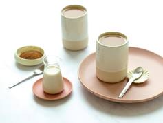Mugs of coffee topped with Creamy Oat Barista Milk and sprinkled with cinnamon. Small plates with spices