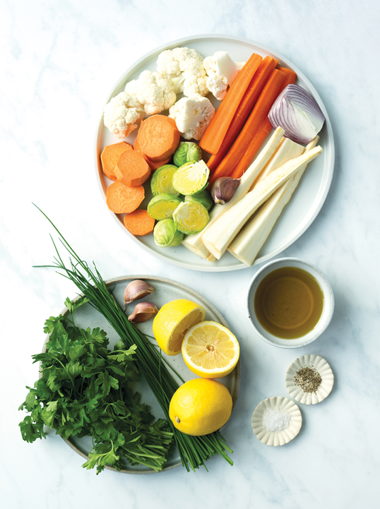 • Preheat the oven to 400 F. Place the cut vegetables on a sheet pan and toss with a olive oil, salt, and pepper. Roast the vegetables for 20-25 minutes, stirring once, until fork tender and lightly browned. Remove the vegetables from the oven and grate a clove of garlic over the vegetables and toss to combine.⁣