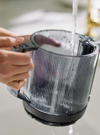 Just like the J2, you can clean the juicer in no time. The blender comes with a cleaning preset so you can add a little water and soap, turn the dial to Clean, and you're done.